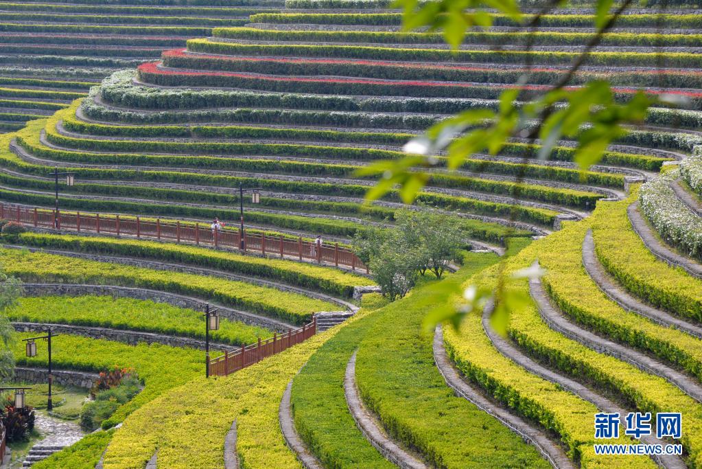 人们走在贵州省毕节市大方县奢香古镇的花海梯田间(7月15日摄)。新华社记者 徐钦 摄