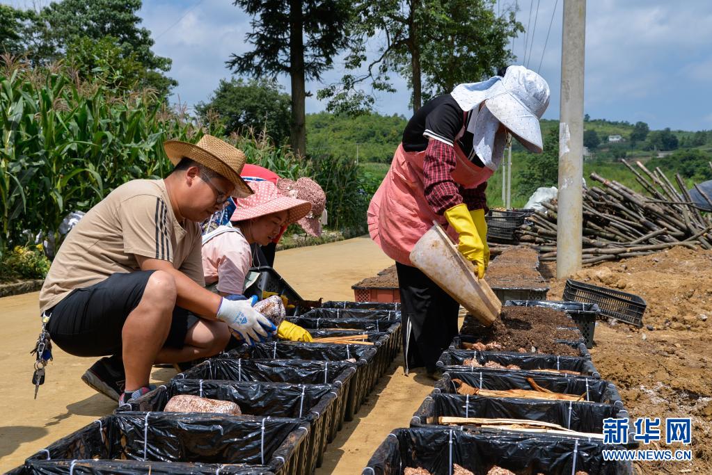 村民在贵州省黔西市绿化乡湾箐村一处种植大棚外装箱栽培红托竹荪(7月14日摄)。新华社记者 徐钦 摄