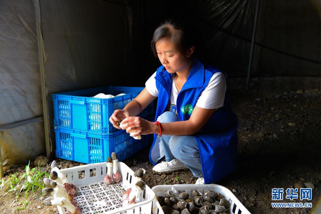 贵州金蟾大山生物科技有限责任公司的工作人员在一处种植大棚内清理红托竹荪(7月16日摄)。新华社记者 徐钦 摄