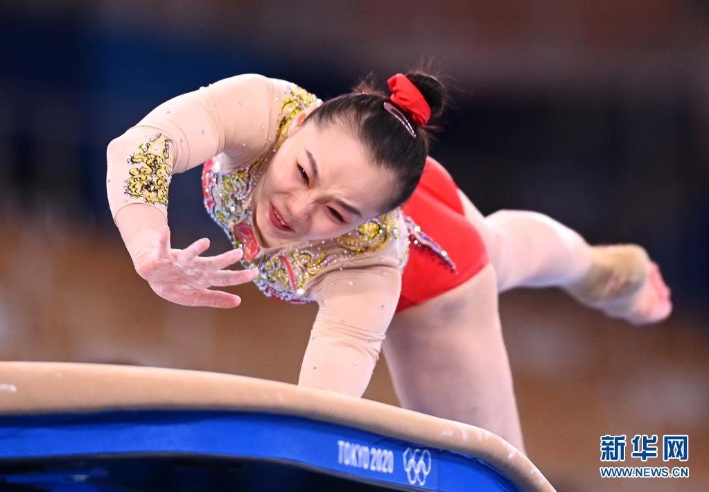 7月22日,中国体操运动员芦玉菲在进行跳马训练。