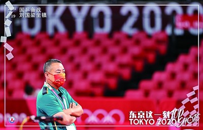 7月19日,中国乒乓球队在东京体育馆进行赛前训练,这是中国乒乓球协会主席刘国梁在训练现场。新华社发