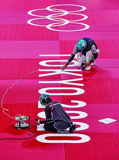 7月21日,日本武道馆内的奥运会工作人员在柔道比赛台垫上张贴奥运标识。新华社发