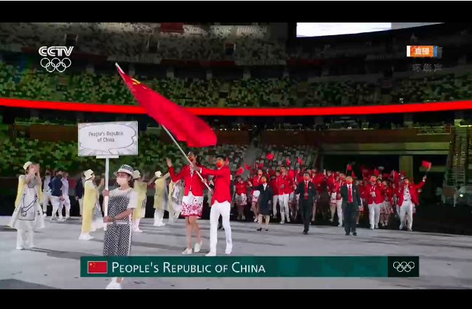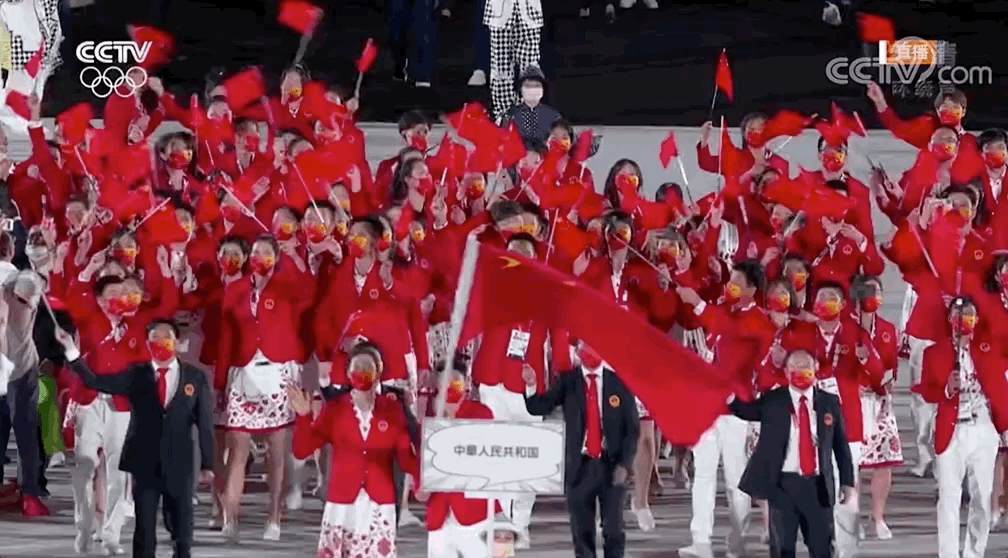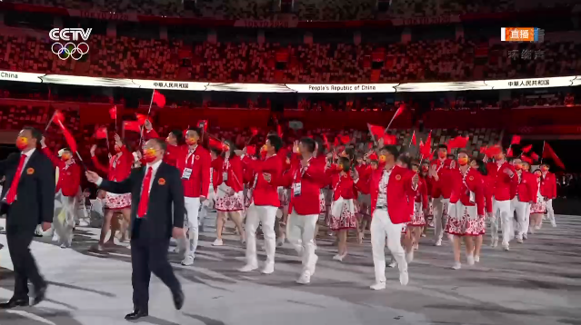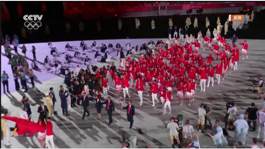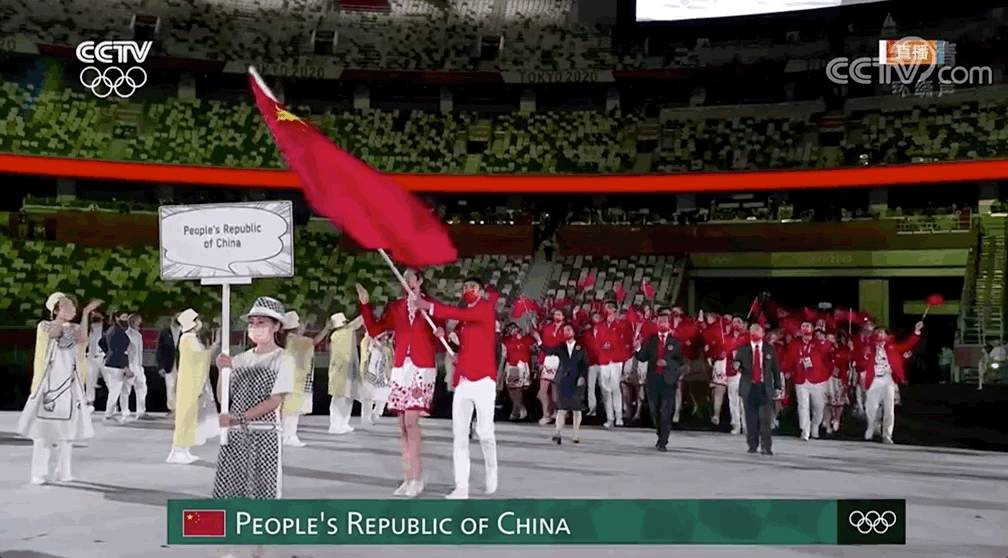 女排运动员朱婷、跆拳道运动员赵帅高擎五星红旗,中国体育代表团步入东京奥林匹克体育场。