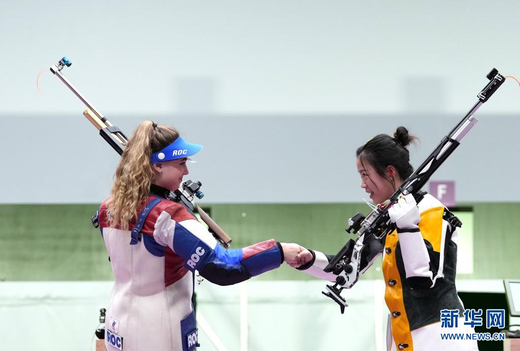 7月24日,杨倩(右)在赛后和亚军俄罗斯运动员阿纳斯塔西娅致意。