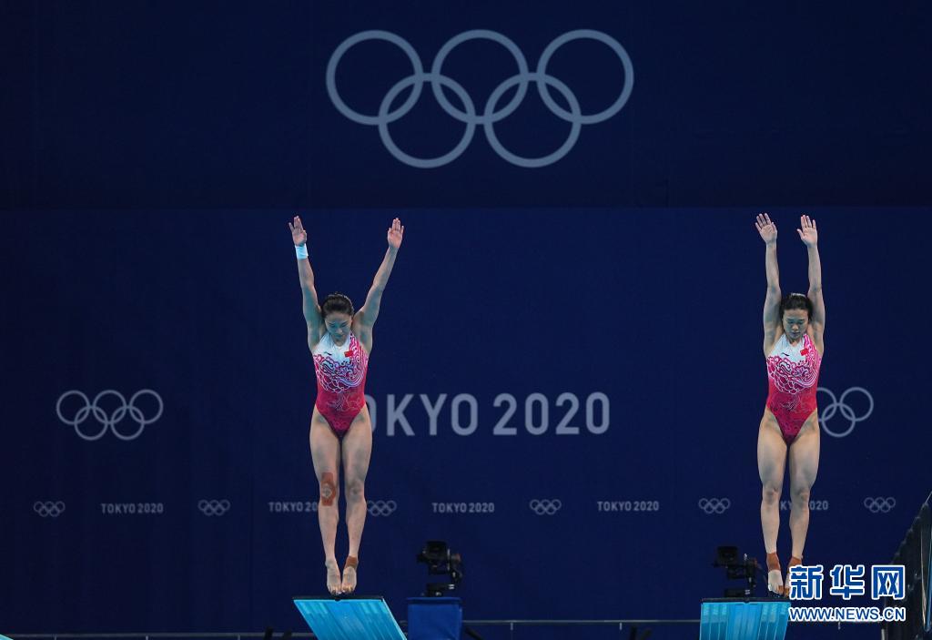 7月25日,中国选手施廷懋(右)/王涵在比赛中。当日,东京奥运会跳水女子双人三米跳板决赛在东京水上运动中心举行。新华社记者 许畅 摄