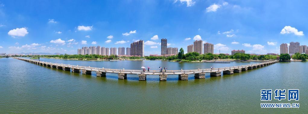 7月8日,游客在福建泉州晋江古石桥安平桥上游览(无人机照片)。