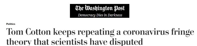 这位来自阿肯色州的参议员曾多次表示,虽然他没有证据证明病毒起源于实验室,但是必须要寻找相关证据,这些表态其实已经带有非常强烈的有罪推定的色彩。其他一味鼓吹叫嚣实验室泄漏的人也从未拿出实质性的证据。《华盛顿邮报》指出,以汤姆·科顿为代表的观点就是一场阴谋论。