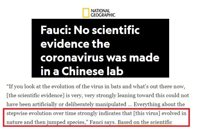 去年5月,美国国家过敏症和传染病研究所所长福奇向《美国国家地理》杂志表示,所有关于逐级进化的证据都强烈指向,新冠病毒是在自然界进化完成,然后再跨越物种传到人身上的。