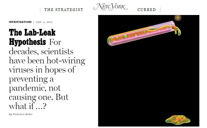 其后“实验室泄漏说”在美国掀起的一点小风浪,源自今年1月小说家尼克尔森·贝克在《纽约杂志》上发表的一篇封面文章,文章中提到了一个精心设计的实验室。