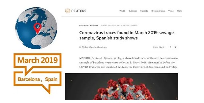 路透社2020年6月报道说,西班牙巴塞罗那大学领导的一个研究小组在2019年3月采集的巴塞罗那废水样本中检测出新冠病毒。