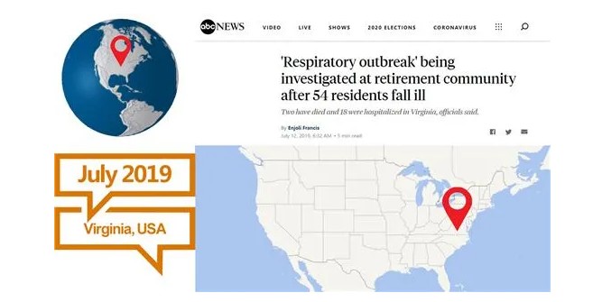 美国广播公司2019年7月的新闻显示,在美国弗吉尼亚州一个退休人员社区,暴发了一种不明原因的呼吸系统致命性疾病,造成54人染病。这一退休人员社区距离神秘的美国军方德特里克堡生物实验室不过1小时车程。