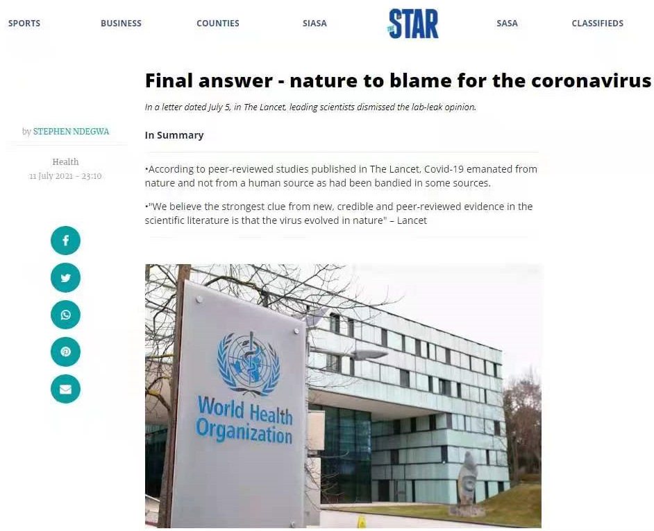 近日,肯尼亚《星报》发表学者恩德格瓦的评论文章,引用《柳叶刀》杂志发表的科学家公开信主要内容,驳斥新冠病毒“实验室泄漏”阴谋论,赞赏中国团结抗疫,呼吁各国尊重科学、集中力量和资源抗击疫情。
