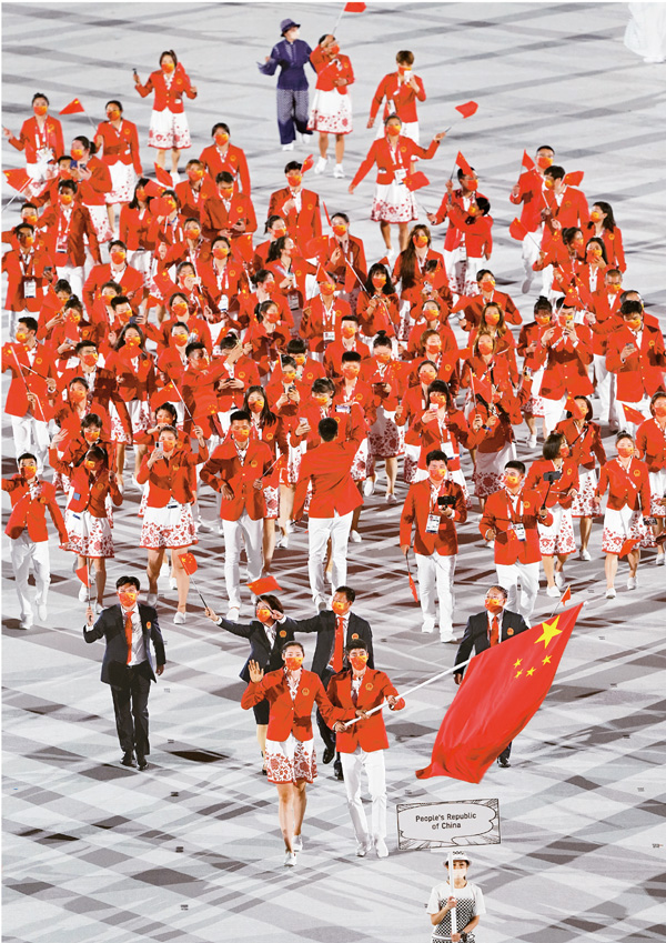 2021年7月23日,第32届夏季奥林匹克运动会开幕式在日本东京举行。图为中国体育代表团在开幕式上入场。 新华社记者 许畅/摄