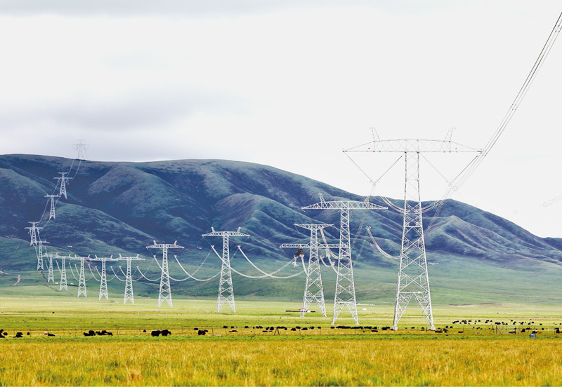 2020年7月15日,世界上首条主要输送风光新能源的青豫特高压开始输电。源自青藏高原的太阳能、风能等清洁电力,跨过崇山峻岭,源源不断直送中原大地。随着配套电源建设,青豫特高压预计到2023年底可实现满功率运行。届时这条电力“高速公路”每年将输送绿电412亿千瓦时,相当于1/3个三峡大坝的发电量。图为2021年6月17日在青海省黄南藏族自治州河南蒙古族自治县拍摄的青豫特高压直流工程。 新华社发 谢莉蓉/摄
