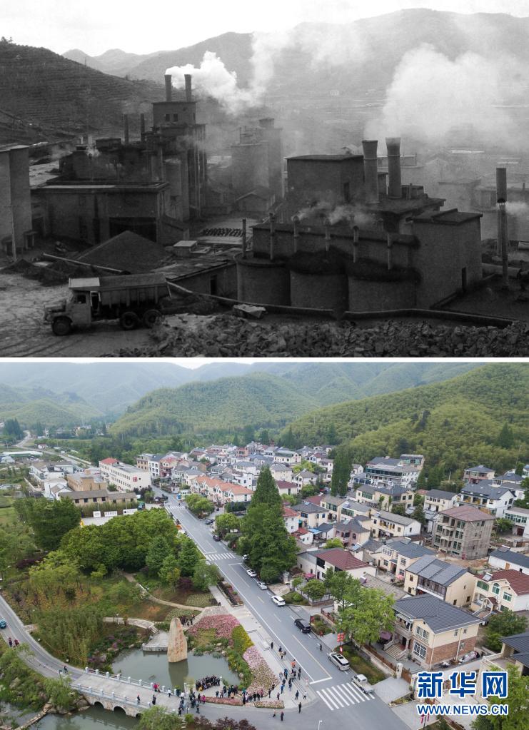 拼版照片:上图为浙江省湖州市安吉县天荒坪镇余村二十世纪八十年代的资料照片;下图为2018年4月24日,游客在整修一新的余村游览(新华社记者翁忻旸摄)。 新华社发