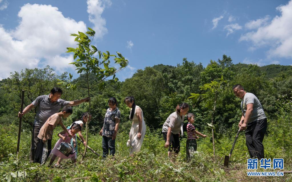 姚祖元(右一)与家人一起种树(2019年7月13日摄)。在秦岭深处的陕西省汉中市留坝县火烧店镇,姚家5代人历时70年深耕秦岭的故事在当地家喻户晓,传为佳话。 新华社记者 陶明 摄