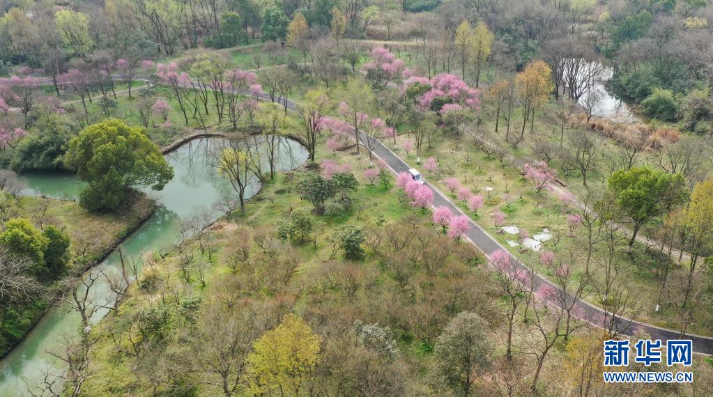 观光车在浙江杭州西溪湿地内行驶(2021年3月2日摄,无人机照片)。 新华社记者 翁忻旸 摄
