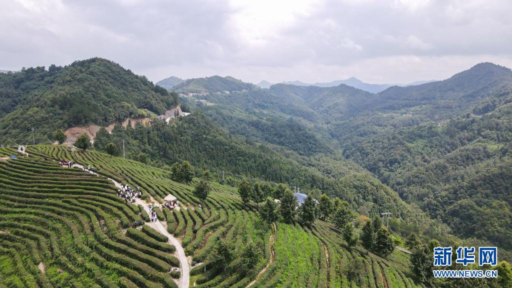 游客在位于陕西省安康市平利县老县镇蒋家坪村的女娲凤凰茶业现代示范园区参观游玩(2021年7月24日摄,无人机照片)。 新华社记者 徐钦 摄