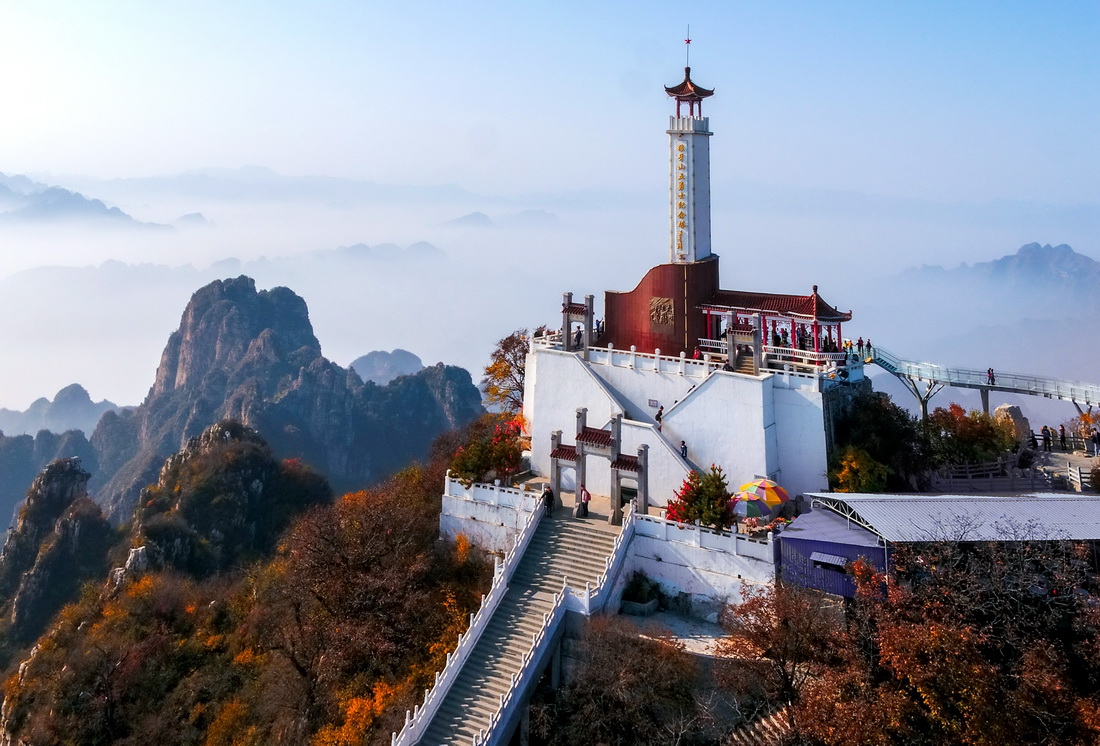 这是狼牙山棋盘陀峰顶的“狼牙山五勇士纪念塔”(2017年10月27日摄,无人机照片)。新华社发