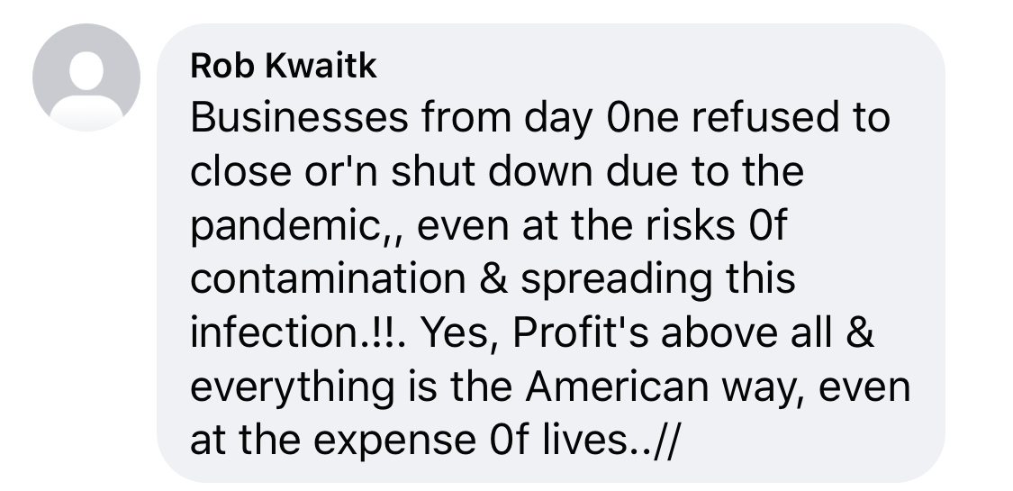 网友Rob Kwaitk留言:“商家们从第一天开始就拒绝因为疫情而关门,哪怕冒着疫情扩散的风险!没错,利益至上才是美国方式,哪怕付出生命的代价也在所不惜。”