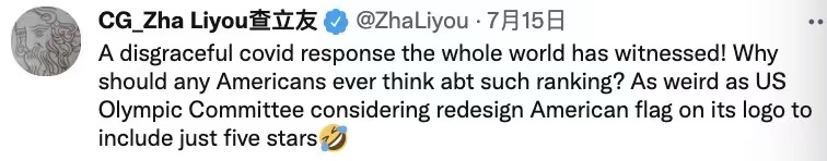 网友Zha Liyou留言:“让全世界见证了如此丢人的疫情应对方式!为什么美国人竟然会想出这样的排名来?”