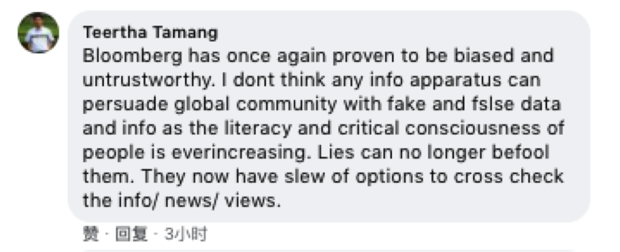 网友Teertha Tamang留言:“彭博社再次被证明是有偏见的、不值得信任的。我不认为任何信息机构可以用虚假的数据和信息来说服全球民众,因为人们的读写能力和批判意识在不断提高。谎言再也骗不了他们了。他们现在有大量的选项来交叉检查信息、新闻、观点。”