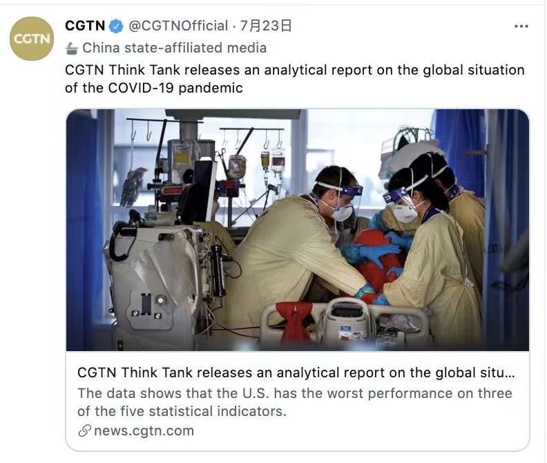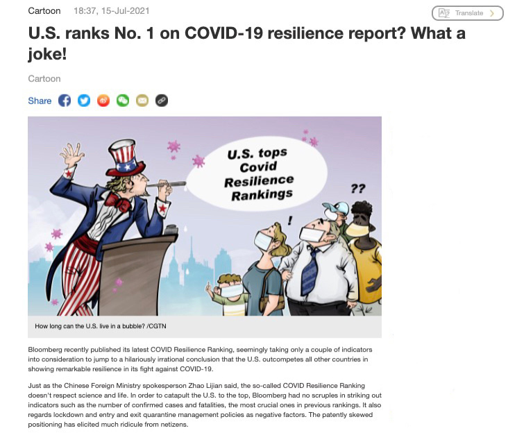 日前,美国彭博社更新了所谓“抗疫韧性排行榜”,美国位列第一、中国排在第八,排行榜还指出中国抗疫存在若干所谓“缺点”。CGTN就此作出回应,发布了《彭博社的全球抗疫排名体现了“商业第一,人民倒数第一”》一文,揭露彭博社“排行榜”的真相。