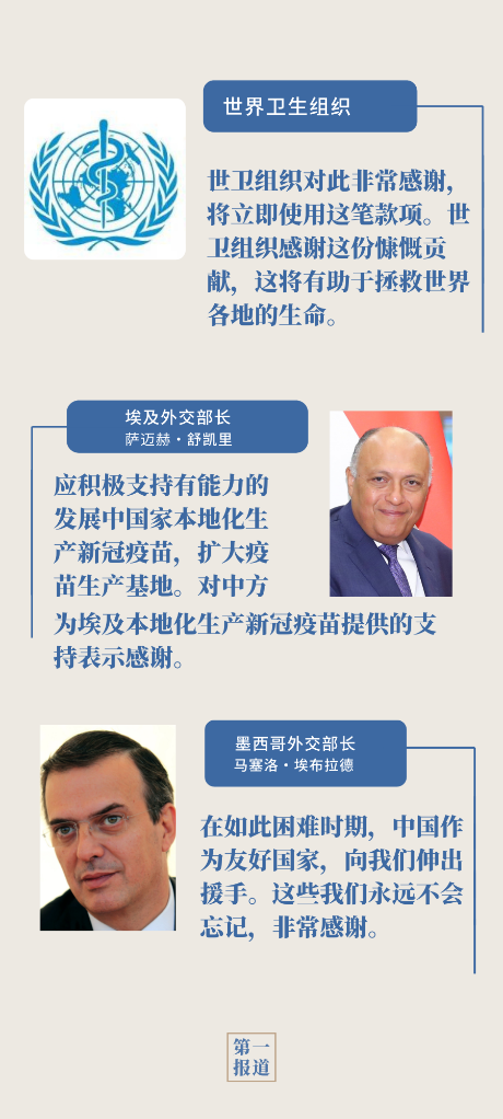推动全球抗疫,特别是帮助广大发展中国家获取疫苗、应对疫情,中国的贡献有目共睹,国际机构和发展中国家代表予以高度评价——