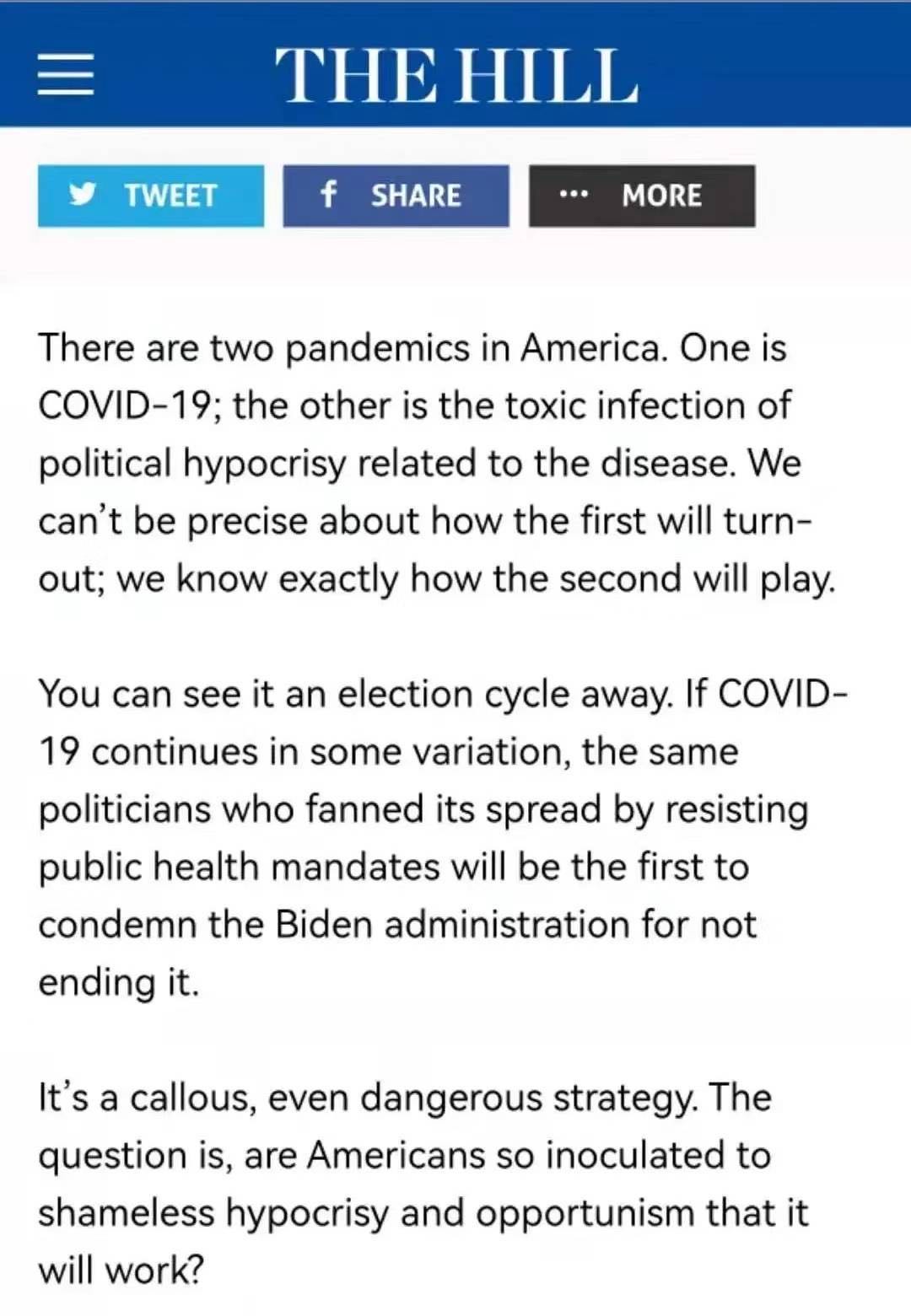 美国《国会山报》撰稿人史蒂夫·伊斯雷尔也发文指出,美国目前正存在着与新冠病毒有关的政治伪善,而这种政治伪善与新冠病毒同样危险。