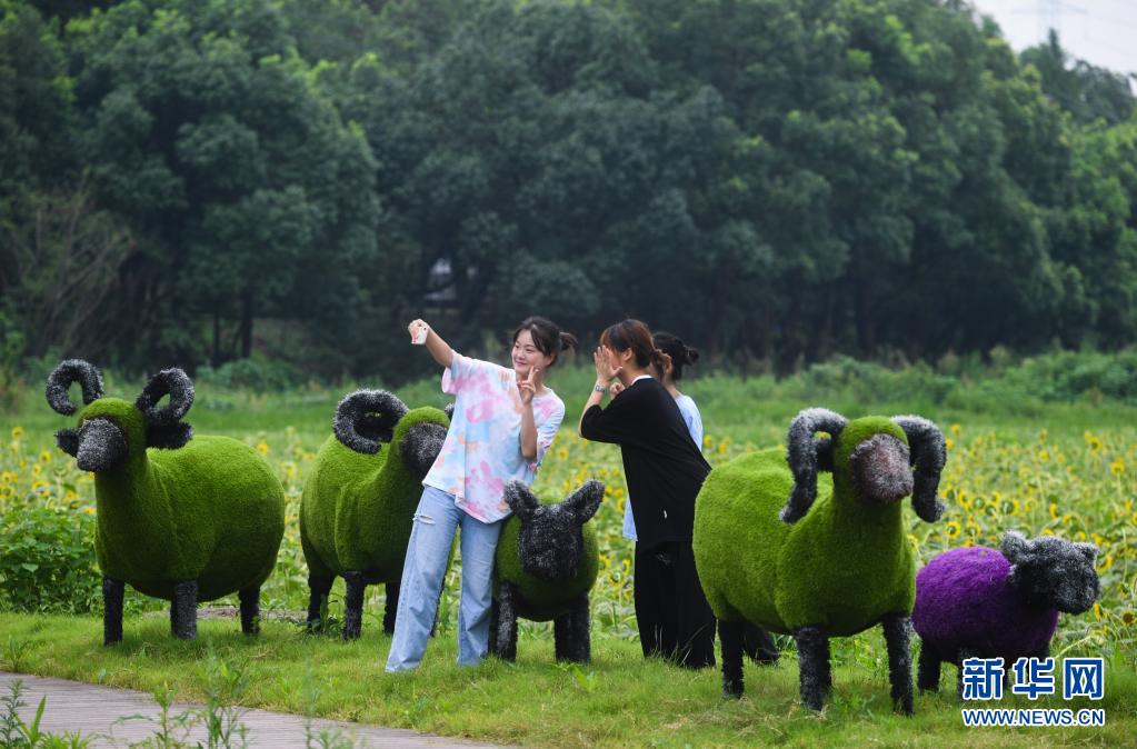 8月10日,几名游客在南山村特色度假小镇的向日葵花田旁自拍留影。
