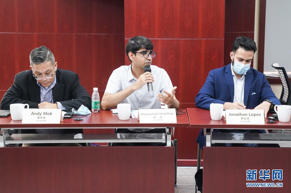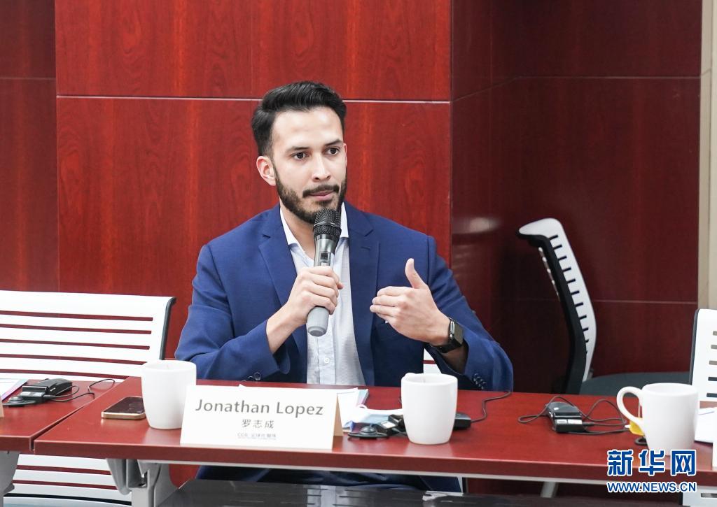 8月12日,哥伦比亚、加拿大双国籍青年罗志成在“命运与共 青春力量”专题研讨会上发言。新华社记者 陈晔华 摄
