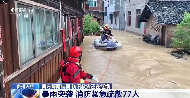 13日晚8时起,贵州天柱县多地出现大暴雨,最大降雨量157.4毫米。14日5时,天柱县邦洞街道三团村低洼地带部分房屋一楼进水,群众被困家中。消防员利用皮划艇、大铁盆营救疏散群众,同时通过救援绳牵引,近2个小时紧急疏散群众77人。