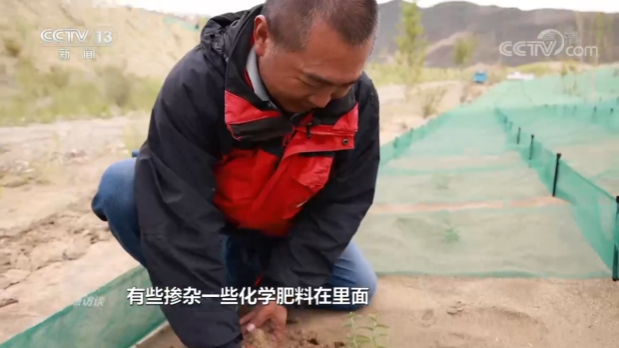 中国科学院西北生态环境资源研究院研究员常学向说:“在下面埋了一点保水剂,吸水比较好,当植物缺水的时候,它慢慢把水分再释放给植物,掺杂了一些化学肥料在里面。”