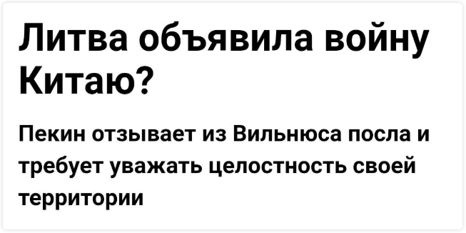 这是俄罗斯媒体“自由新闻网”对立陶宛最近一系列反华行动的讽刺。这篇名为《立陶宛对中国宣战?》的报道中写道:立陶宛政府已经把自己逼入绝境。