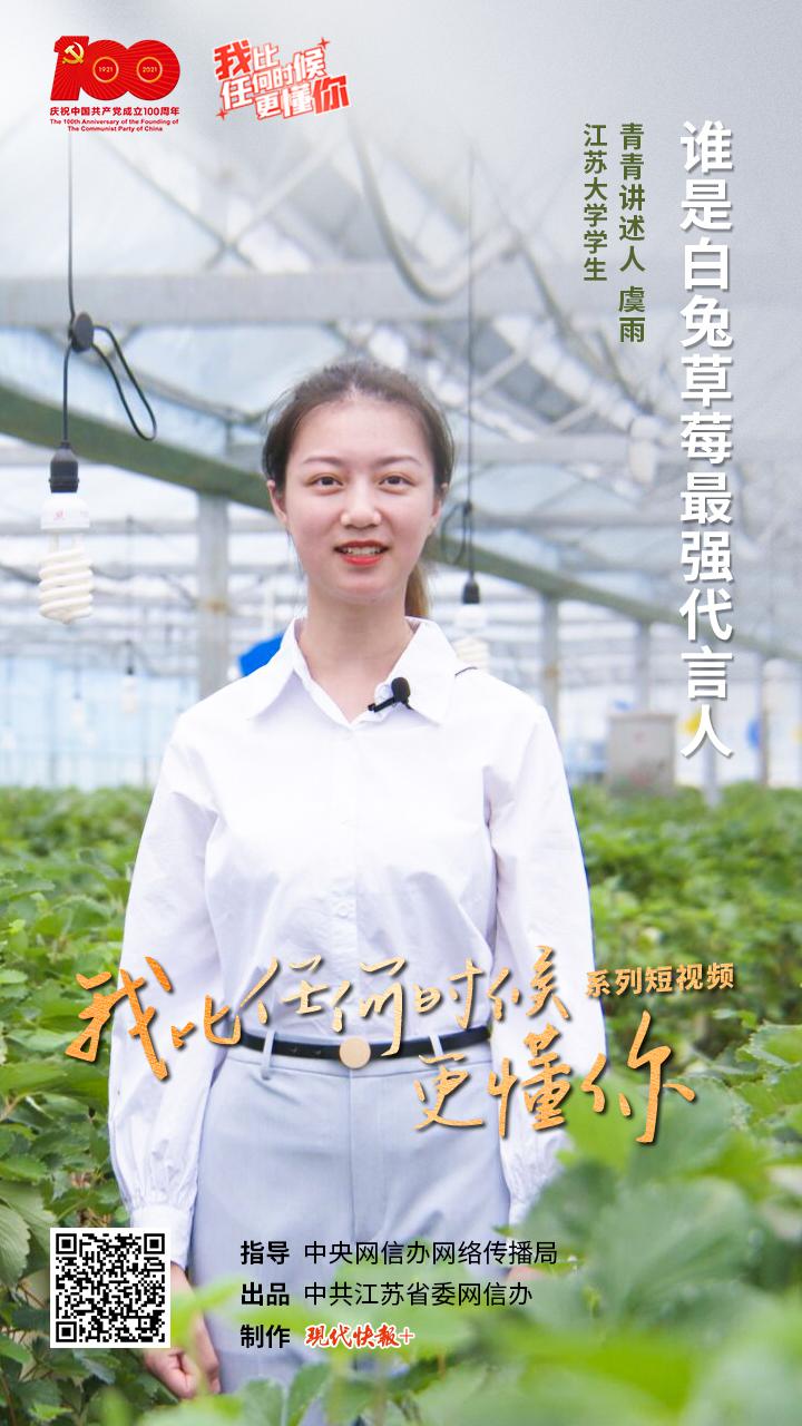 8 月 21 日," 我比任何时候更懂你 " 系列短视频第 28 集《谁是白兔草莓最强代言人?》上线,本集青青讲述人是江苏大学学生虞雨。