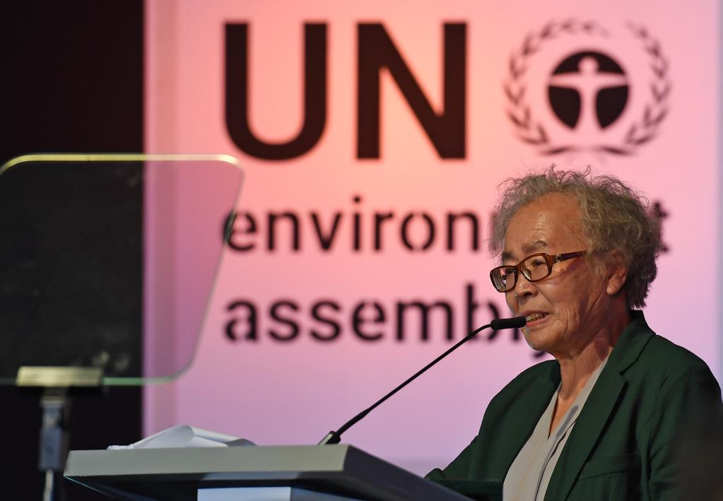 2017年12月5日,在肯尼亚内罗毕联合国环境规划署总部,塞罕坝第一代务林人代表陈彦娴在颁奖晚会上发表获奖感言。新华社记者 陈诚 摄