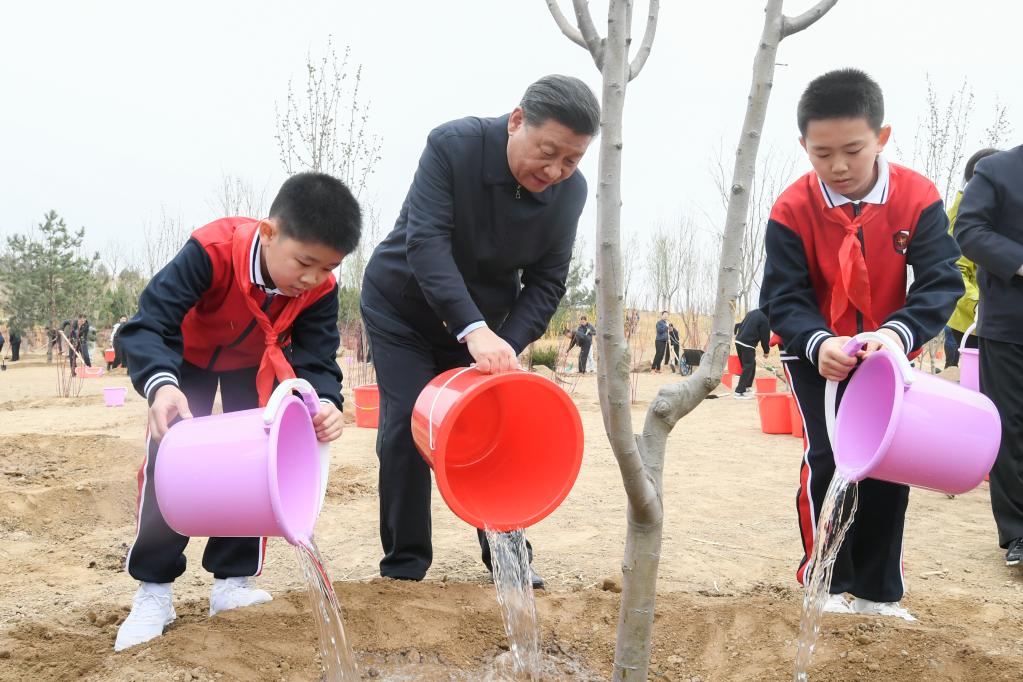 2021年4月2日,习近平总书记来到北京市朝阳区温榆河参加首都义务植树活动。这是习近平总书记同少先队员一起给刚栽下的树苗浇水。新华社记者 李学仁 摄