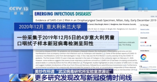去年12月,米兰大学另一组研究人员在美国《新型传染病杂志》上报告说,一份采集于2019年12月5日的4岁男童口咽拭子样本新冠病毒检测呈阳性。该男童在那之前一段时间没有外出旅行史。