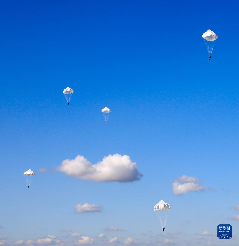 8月23日,参加“空降排”空降兵分队比赛的中国参赛队队员在俄罗斯梁赞州跳伞。新华社发(方超 摄)