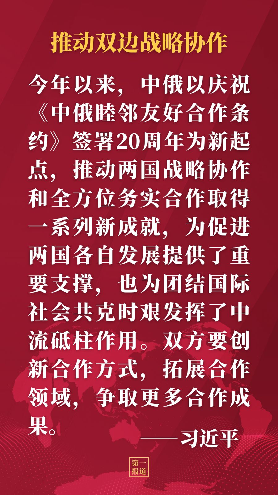 习近平指出,今年以来,中俄以庆祝《中俄睦邻友好合作条约》签署20周年为新起点,推动两国战略协作和全方位务实合作取得一系列新成就,为促进两国各自发展提供了重要支撑,也为团结国际社会共克时艰发挥了中流砥柱作用。双方要创新合作方式,拓展合作领域,争取更多合作成果。当前,新冠肺炎疫情起伏不定,国际抗疫任务艰巨,中方愿同俄方深化疫苗研发生产合作,保障疫苗全球供应链安全稳定,维护两国人民生命安全和身体健康,为构建人类卫生健康共同体贡献中俄力量。