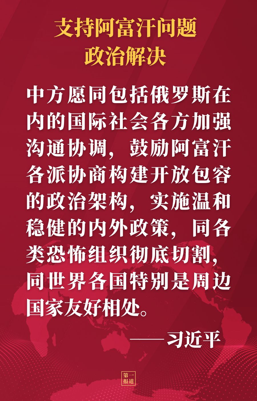 习近平强调,中方尊重阿富汗的主权、独立、领土完整,奉行不干涉阿内政的政策,一直为政治解决阿富汗问题发挥建设性作用。中方愿同包括俄罗斯在内的国际社会各方加强沟通协调,鼓励阿富汗各派协商构建开放包容的政治架构,实施温和稳健的内外政策,同各类恐怖组织彻底切割,同世界各国特别是周边国家友好相处。