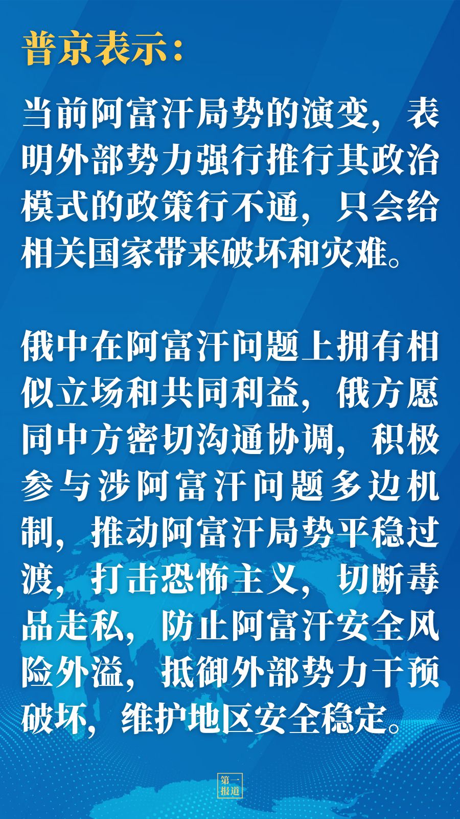 普京表示,当前阿富汗局势的演变,表明外部势力强行推行其政治模式的政策行不通,只会给相关国家带来破坏和灾难。俄中在阿富汗问题上拥有相似立场和共同利益,俄方愿同中方密切沟通协调,积极参与涉阿富汗问题多边机制,推动阿富汗局势平稳过渡,打击恐怖主义,切断毒品走私,防止阿富汗安全风险外溢,抵御外部势力干预破坏,维护地区安全稳定。