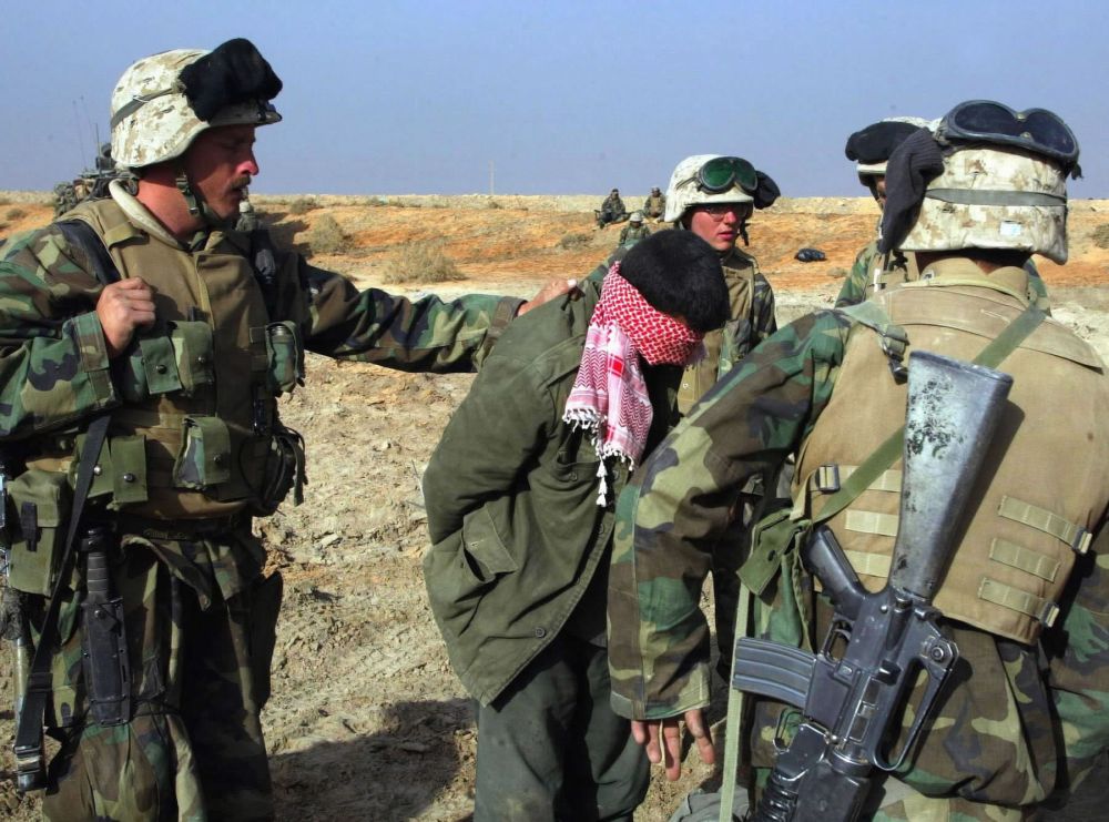 2003年4月1日,美国海军陆战队士兵在伊拉克南部的迪瓦尼耶附近押解一名被蒙上双眼的伊拉克战俘。(新华社发,法切利摄)