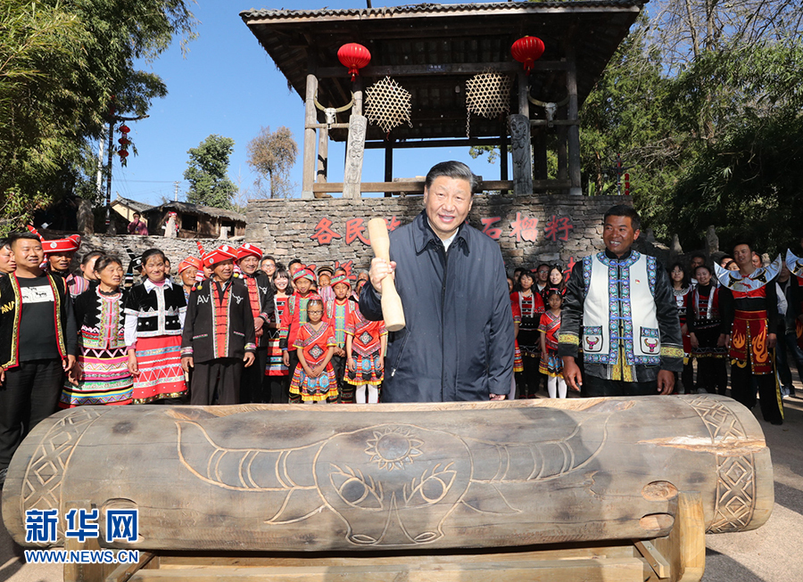 2020年1月19日至21日,中共中央总书记、国家主席、中央军委主席习近平来到云南,看望慰问各族干部群众,向全国人民致以新春祝福。这是19日下午,习近平在腾冲市清水乡三家村中寨司莫拉佤族村广场上,敲响三声佤族木鼓,祝福来年风调雨顺、国泰民安。 新华社记者 鞠鹏 摄