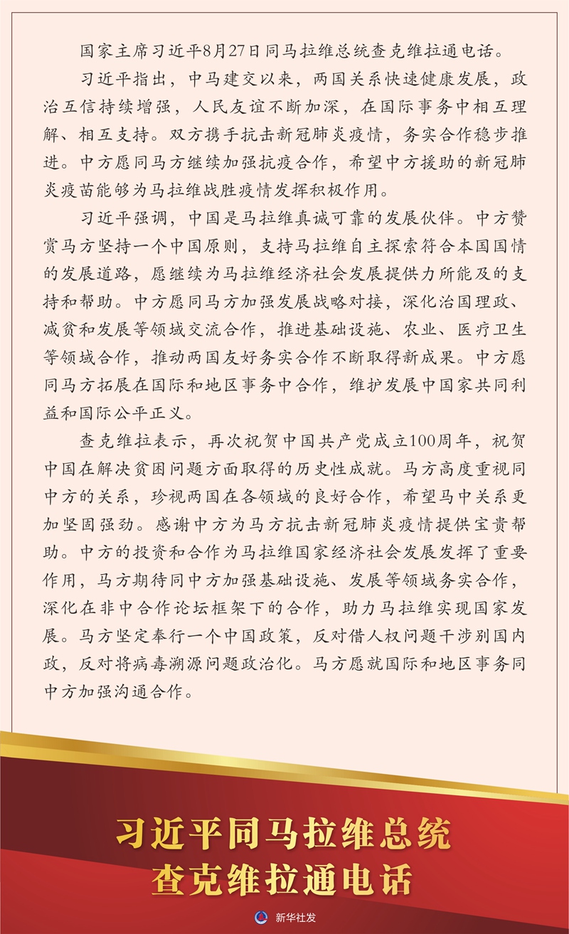 新华社北京8月27日电 国家主席习近平8月27日同马拉维总统查克维拉通电话。