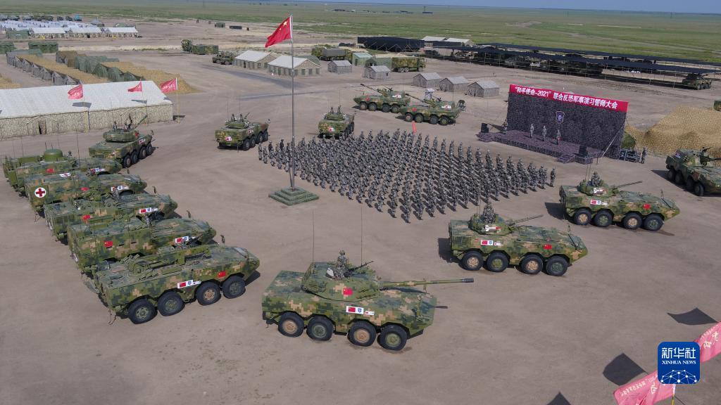 参加“和平使命-2021”联合军演的中方参演部队举行誓师大会(8月15日摄,无人机照片)。新华社发(仲崇岭 摄)