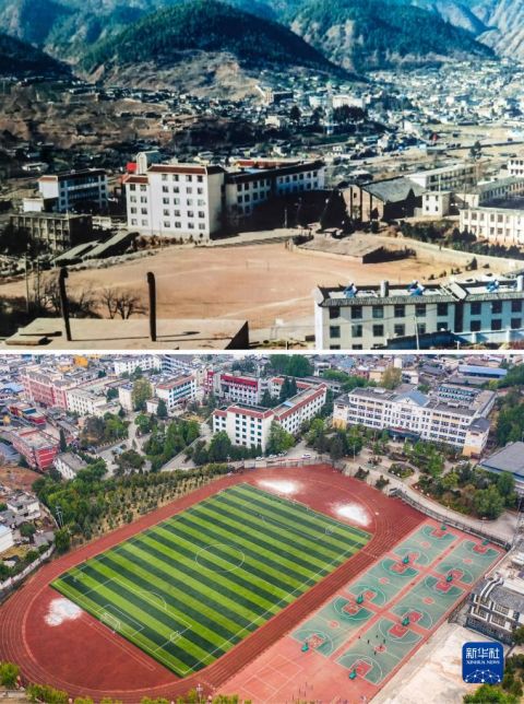 拼版照片,上图为:20世纪90年代的宁蒗宁海民族中学一景(资料照片);下图为:2021年4月16日拍摄的宁蒗宁海民族中学一景(无人机照片,新华社记者胡超摄)新华社发