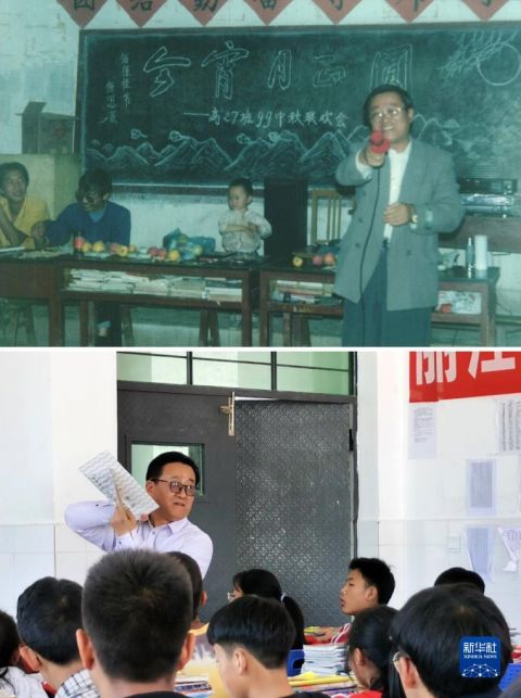 拼版照片,上图为:海安老师王霖伯在宁蒗宁海民族中学高27班教室过中秋节(资料照片,1999年9月摄);下图为:海安老师王霖伯在宁蒗二中高103教室上课(2021年4月23日摄,新华社发)新华社发