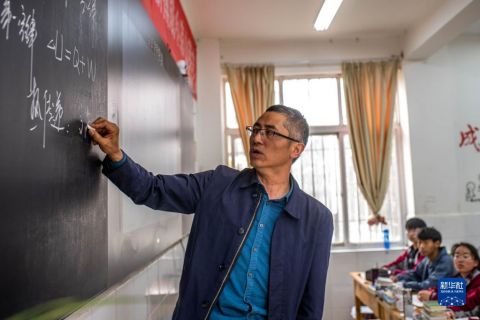 宁蒗宁海民族中学海安4班的班主任谢友军在教室里上课(4月16日摄)。新华社记者 胡超 摄