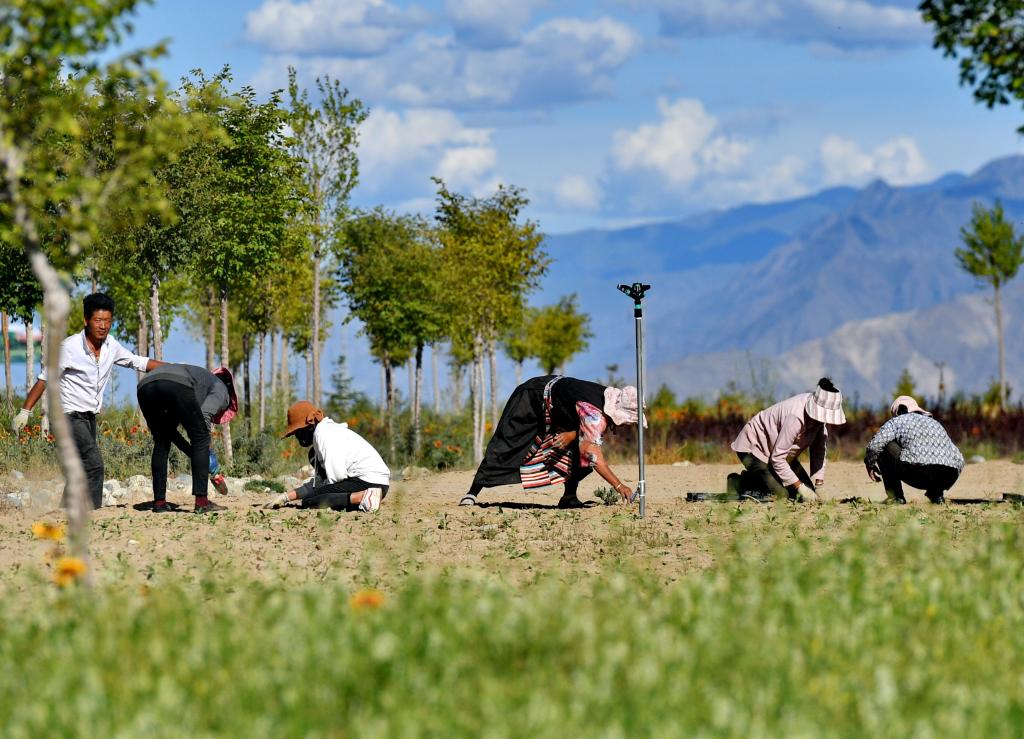 当地群众在山南市扎囊县藏草万亩植物种苗繁育基地劳动(2019年8月29日摄)。新华社记者张汝锋 摄